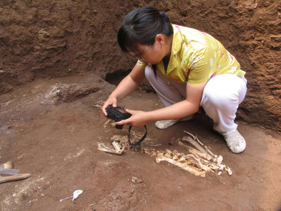 Die Archäologin Hu Songmei fotografiert ein Skelett in einem Grab in Xi’an in der Provinz Shaanxi. Dort entdeckte sie mit ihren Kollegen die Knochen eines ausgestorbenen Gibbons.