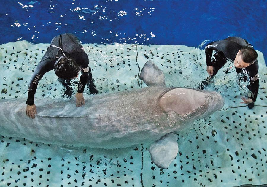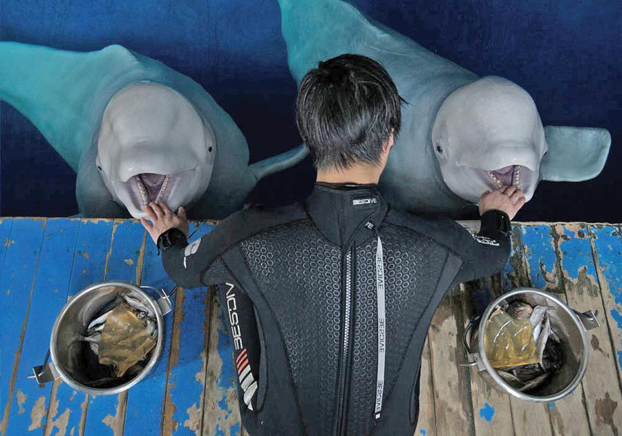 Ein Trainer von Chengfeng Ocean World in Shanghai kümmert sich um Little White und Little Grey.