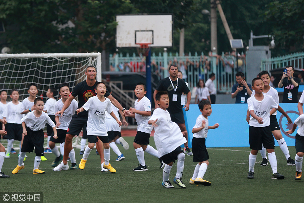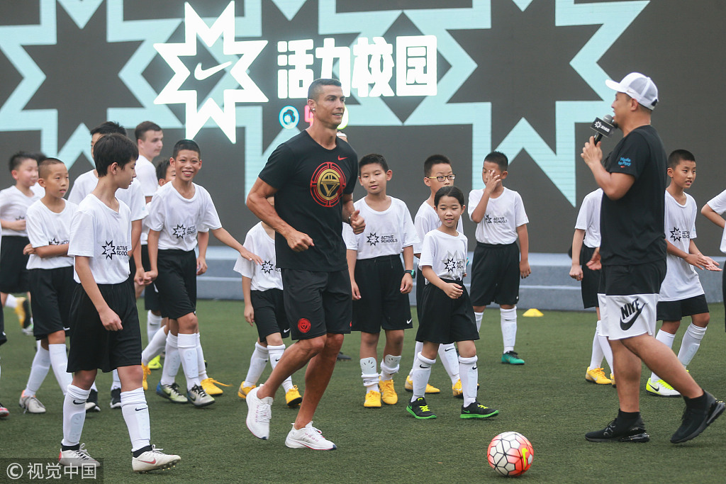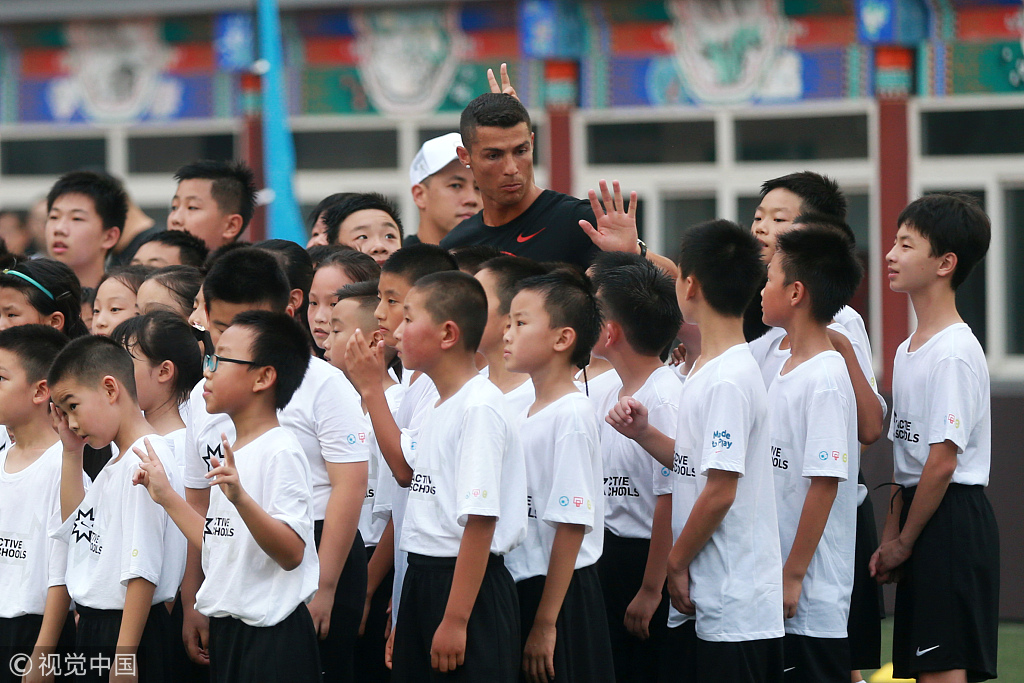 Cristiano Ronaldo hat in der Minzu-Grundschule in Haidian, Beijing einen Fußballkurs mit 90 Schülern gehabt.