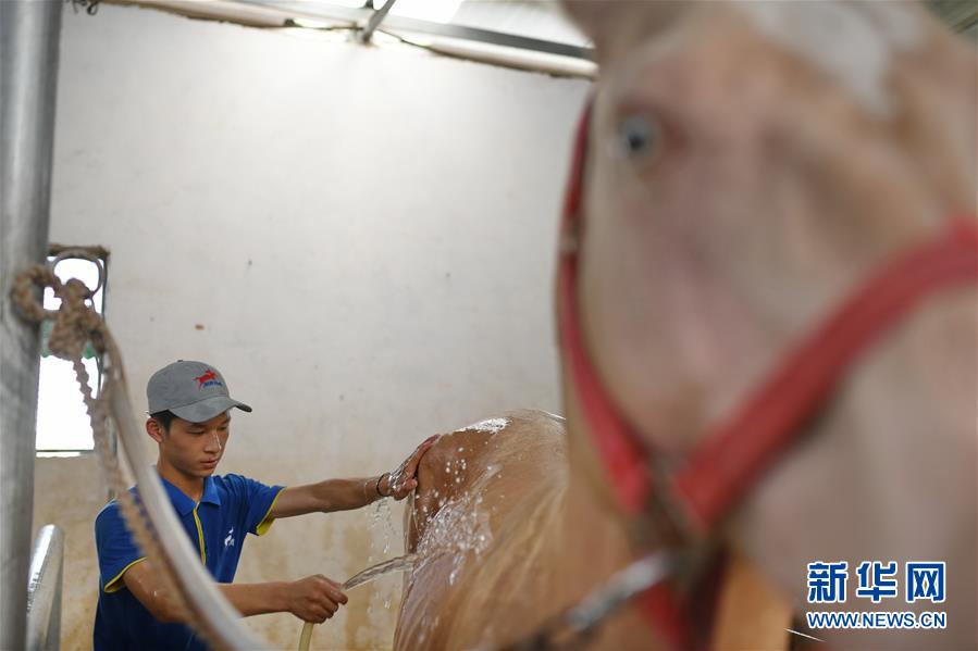 Nach dem Training duscht Huang sein Pferd.