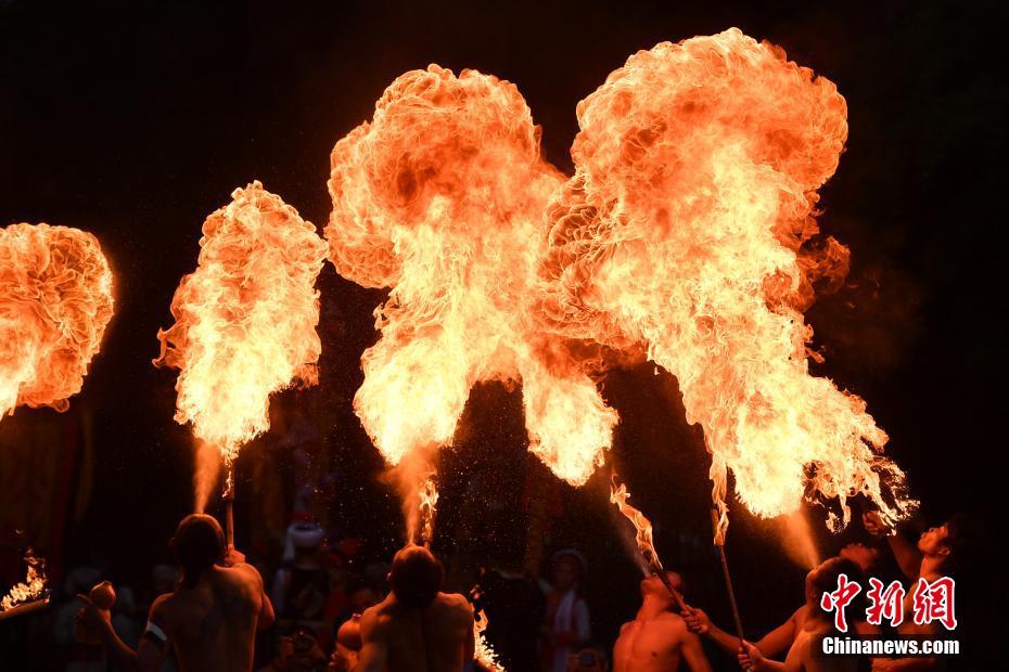 Das Foto vom Donnerstag, den 2. August 2018, zeigt mehrere Yi-Leute, die Feuer spucken.