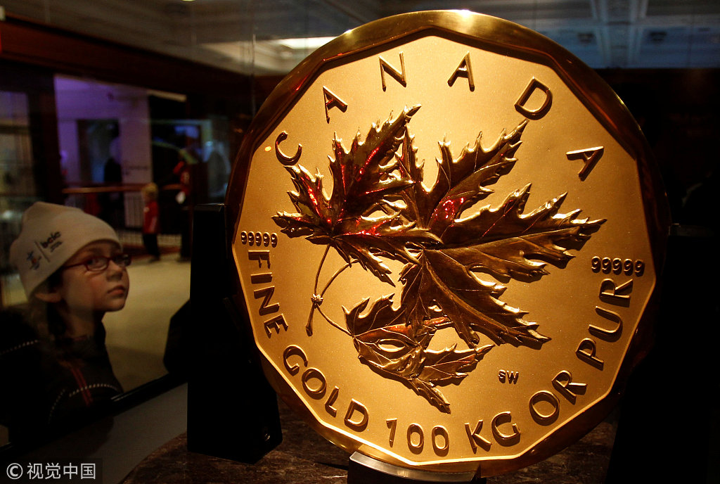 Ein Besucher im Royal Canadian Mint betrachtet eine 100 Kilogramm schwere Medaille aus reinem Gold der Olympischen Winterspiele in Vancouver 2010.
