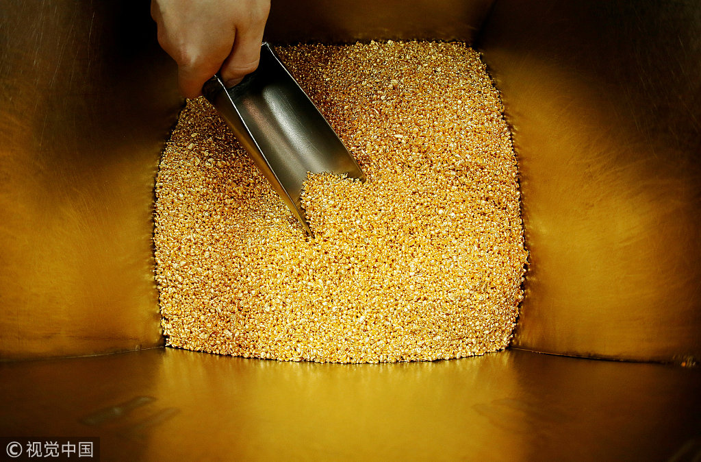 Ein Mitarbeiter untersucht Kügelchen von 99,99-prozentigem, reinem Gold vor dem Verpackungsprozess in einer der weltweit größten Produktionsfabriken für Edelmetallindustrie, Krasnojarsk, Oktober 2016.