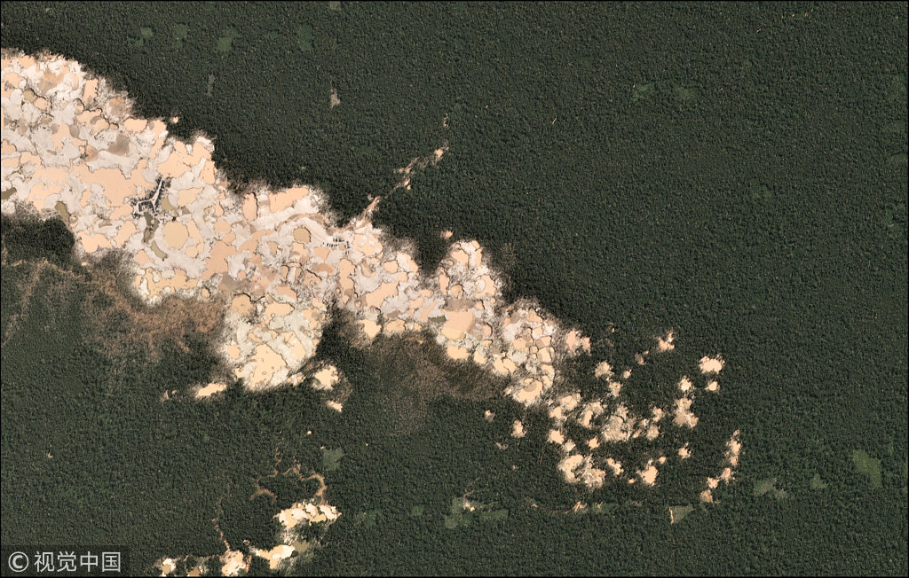 Goldgewinnung durch Rodung ist auf diesem Satellitenbild von der südlichen Amazonasregion in Madre de Dios von Peru zu erkennen.