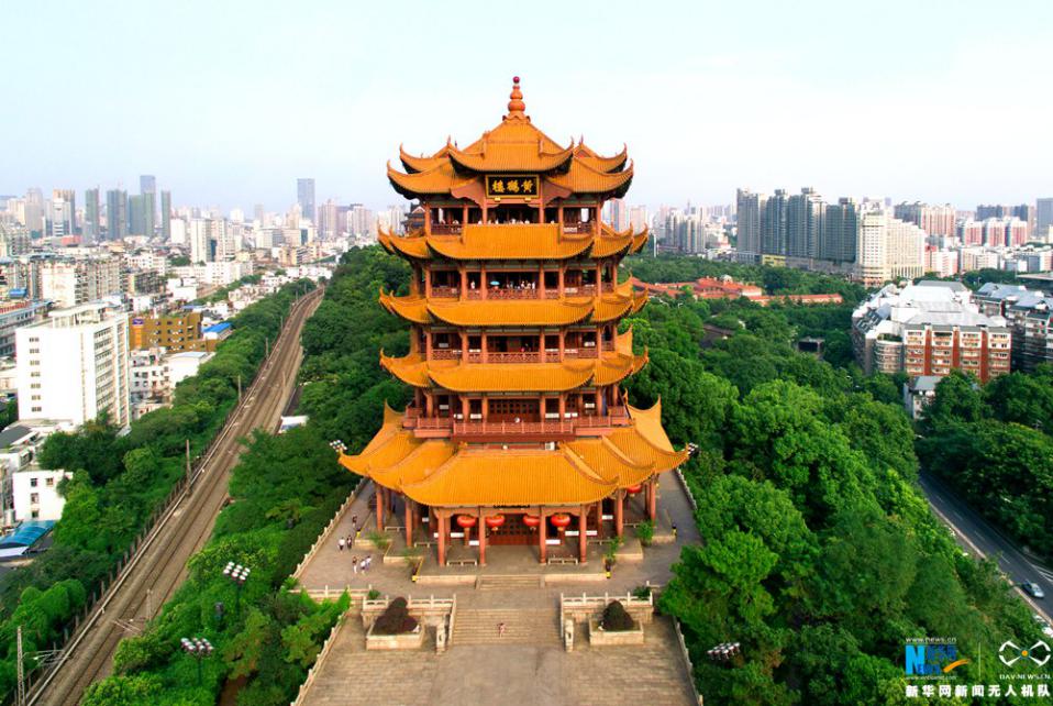 Die Gelbe Kranichpagode liegt auf der Bergspitze des Sheshan. Die Züge auf der Eisenbahnstrecke zwischen Beijing und Guangzhou fahren unter der Pagode vorbei.