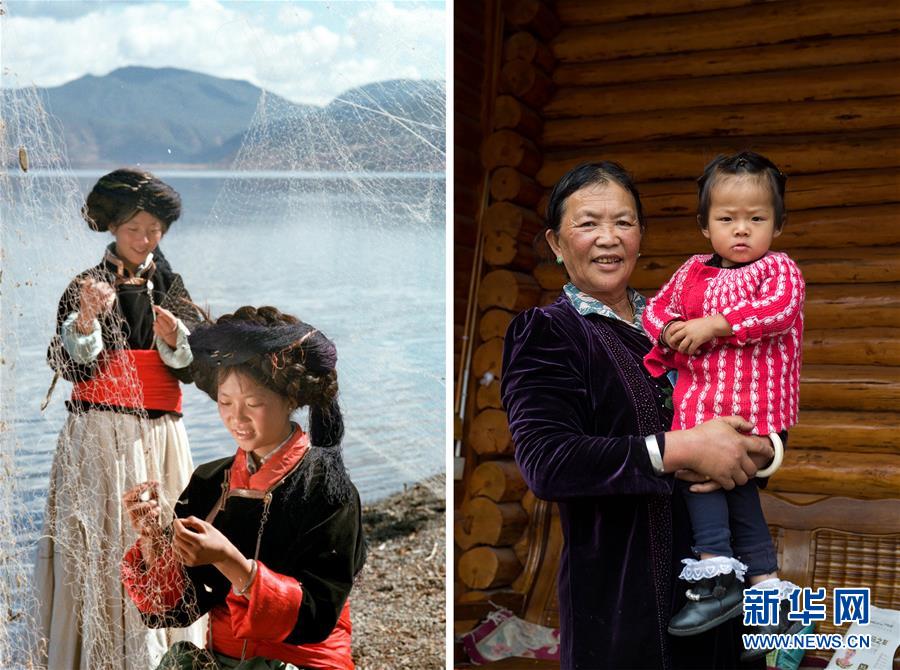 Links: Die Mosuo-Frau Cili Drolma (r.) und ihre Freundin flicken im Jahr 1980 im Dorf Luoshui das Fischernetz.