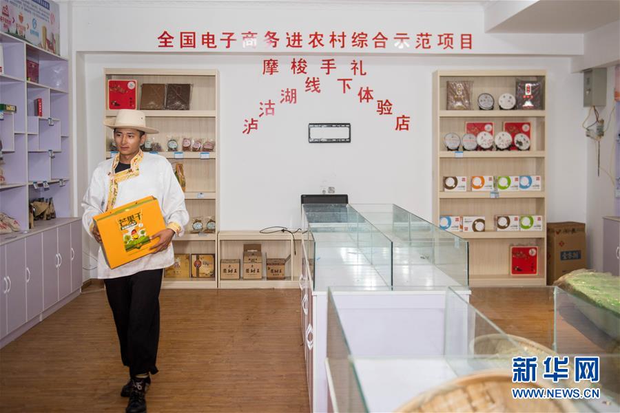 Der Mosuo-Junge Cili Dashi ordnet in dem Experience-Shop für E-Kommerz im Dorf Luoshui in Ninglang Agrarprodukte.