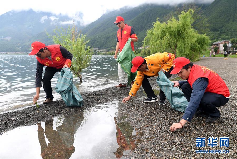 Cili Phuntsok (der 2. rechts) und seine Mitbewohner im Dorf Luoshui, Ninglang, durchsuchen Abfälle am Ufer des Lugu-Sees.