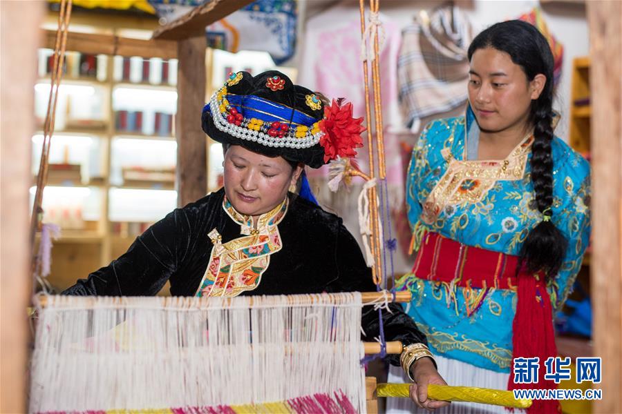 Das Mosuo-Mädchen Penba Lhamo (r.) lernt am 30. Juli in dem Museum für Mosuo-Gebräuche im Dorf Luoshui in Ninglang bei Danshi Lhatso das traditionelle Weben von Mosuo.