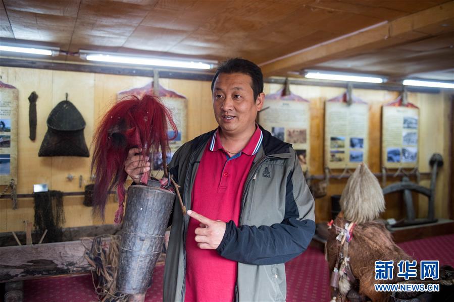 Tsering Doje stellt in dem Museum für Mosuo-Gebräuche seine gesammelten Maultierglocken der früheren Karawanen vor.