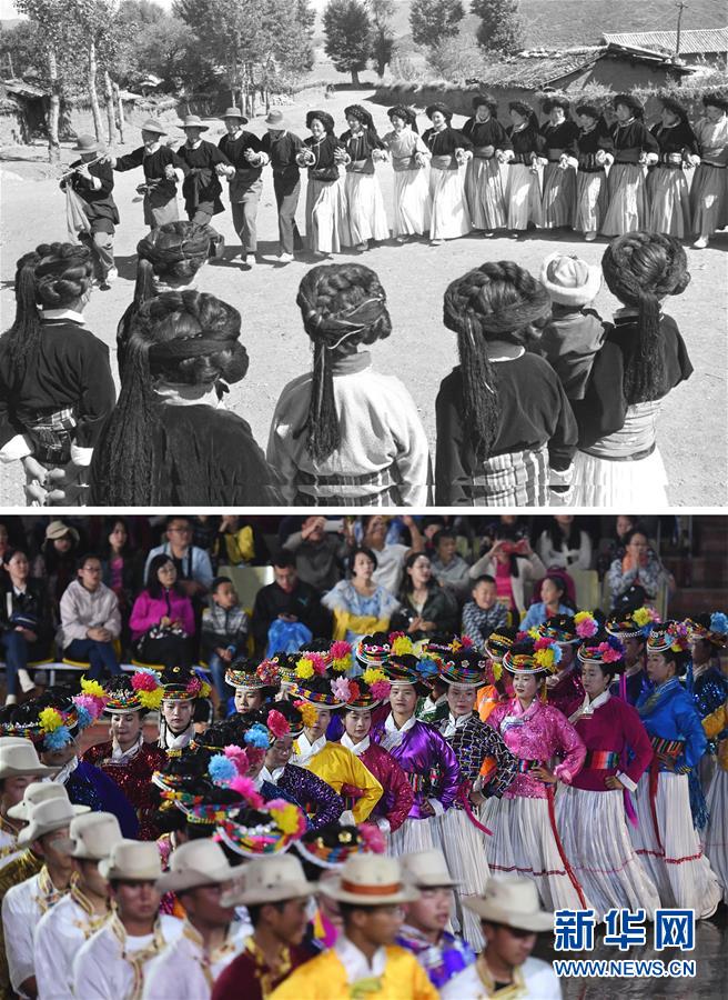 Oben: Mosuo-Leute tanzen im Jahr 1980 den Jiacuo-Tanz, um die Ernte zu feiern. Jiacuo ist ein traditioneller Volkstanz der Mosuo und steht auf der Liste des immateriellen Kulturerbes von China.