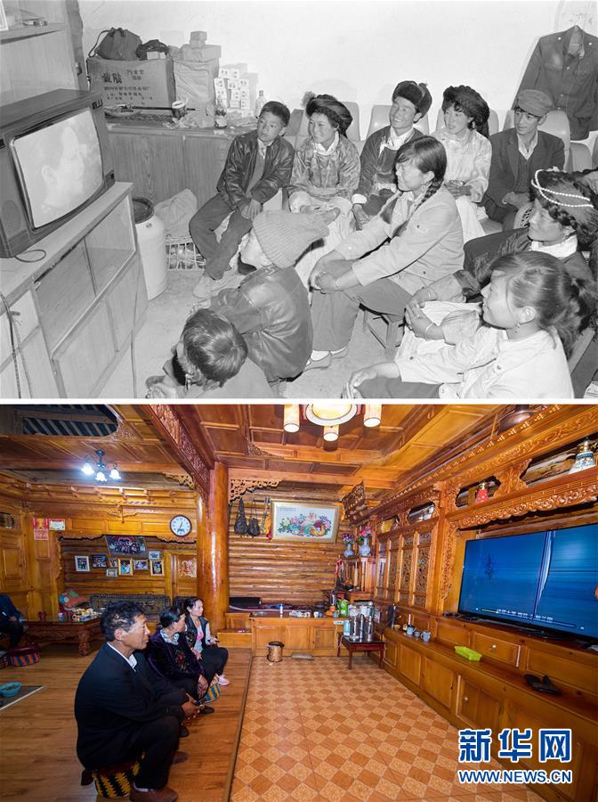 Unten: Am 30. Juli 2018 sitzt die Mosuo-Familie Gowa Phuntsok (1. links) vor einem LCD-Fernseher und sieht Sendungen.