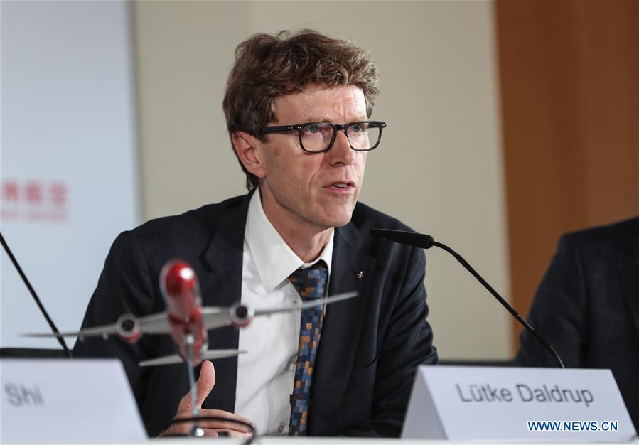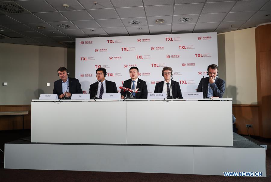 Das Foto vom 5. September 2018 zeigt die Pressekonferenz zum 10-jährigen Jubiläum der Einführung von Direktflügen von Hainan Airlines zwischen Berlin und Beijing auf dem Flughafen Berlin-Tegel. (Xinhua, Shan Yuqi)
