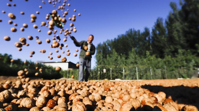 Ein Farmer trocknet geerntete Walnüsse.