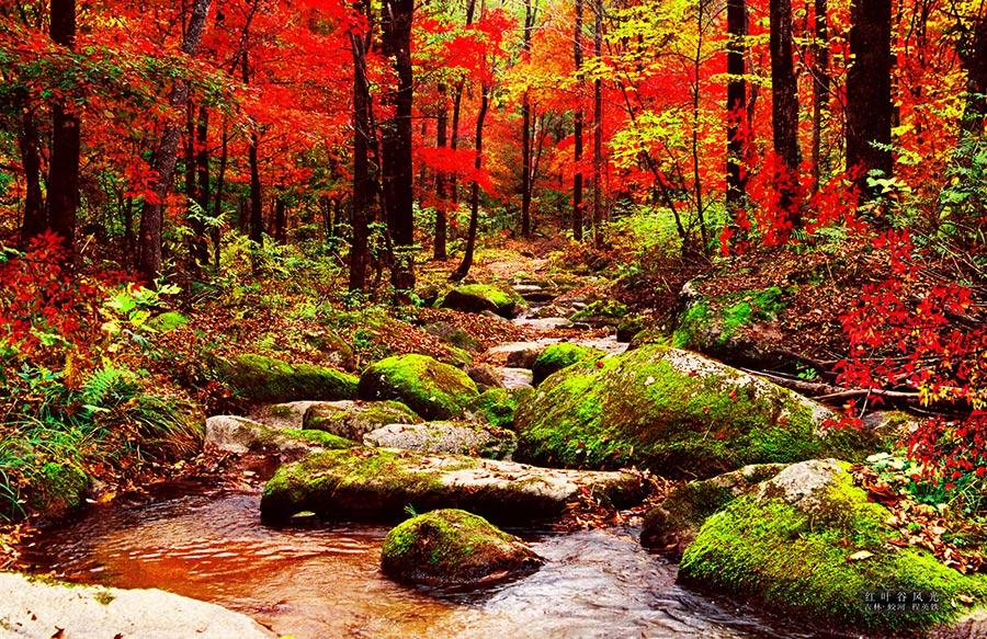 Das Tal der roten Blätter in der Stadt Jiaohe der Provinz Jilin wird von der National Geographic China als eine der zehn schönsten Herbstlandschaften anerkannt. Das Tal am Westfuß des Changbai-Berges ist mit reichlich Bäumen wie Ahorn, Birke, Lärche und Ginkgo bewachsen. Die Farbe der Blätter verwandelt sich im Herbst allmählich von Rot in Gold.