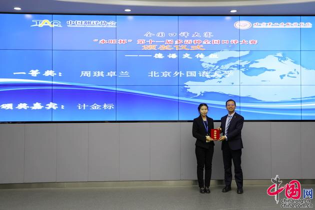 Zhou Qizhuolan, Gewinnerin des Sprachpaars Deutsch-Chinesisch, erhält von Ji Jinbiao, dem Rektor der Beijing International Studies University, die Preisurkunde.