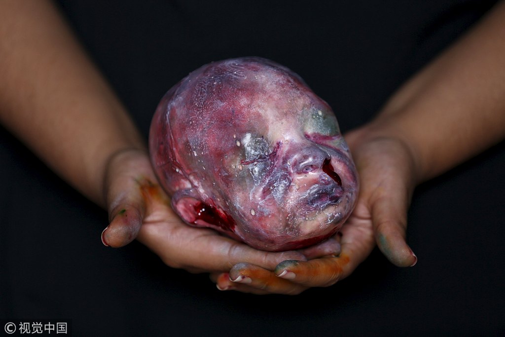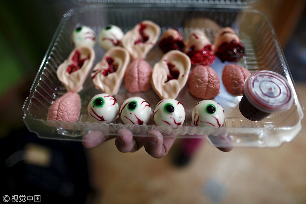 Ein blutiger Zombie-Babykopf, der von Gummisüßigkeiten und rotem Gelee gemacht wird, in Zombie Gourmet, einem Süßigkeitenhersteller im Vorort von Mexiko City am 30. Oktober 2015.
