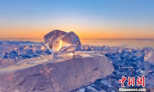 Der Xingkai-See an der chinesisch-russischen Grenze ist im Winter gefroren. Das klare Wasser und das durchsichtige Eis reflektieren die Sonnenstrahlen und bilden eine traumhafte Szene der blauen Eiswelt.