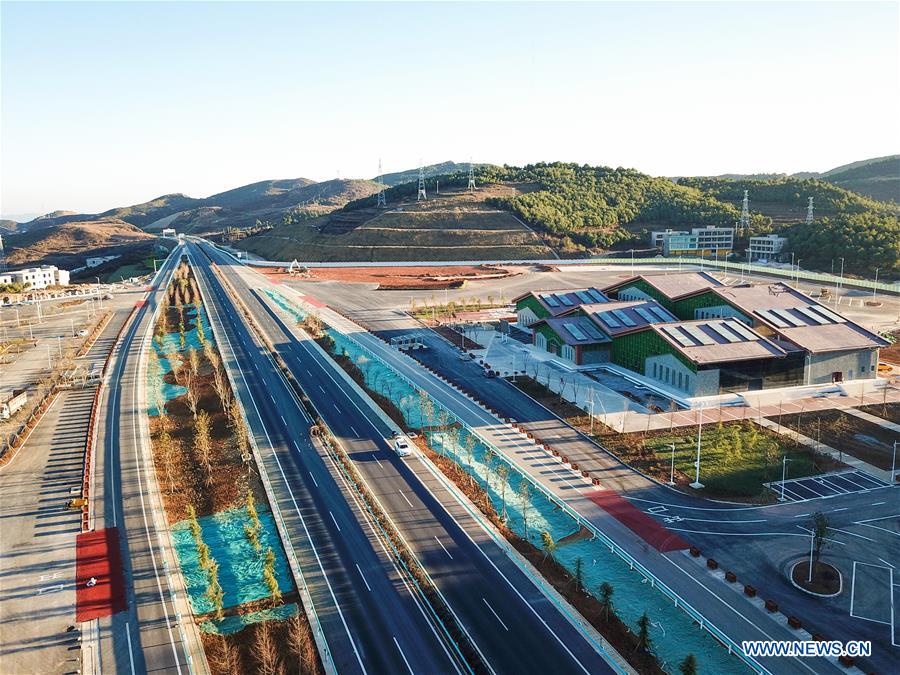 Die Luftaufnahme vom 20. Dezember 2018 zeigt einen Teil der Autobahn Liupanshui-Weining in der südwestchinesischen Provinz Guizhou. Die Autobahn Liupanshui-Weining auf einer Höhe von bis zu 2.260 Metern, die höchste gelegene Autobahn der Provinz, wurde am Donnerstag für den Verkehr freigegeben. (Xinhua / He Huan)