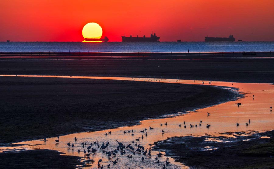 Der Sonnenaufgang über dem Meer in Qinhuangdao in der nordchinesischen Provinz Hebei.