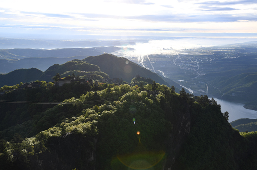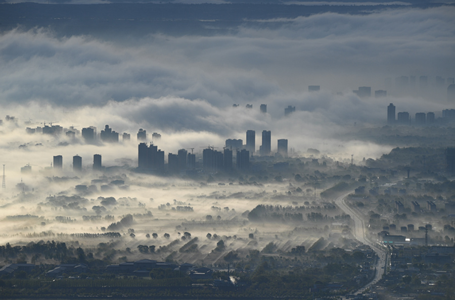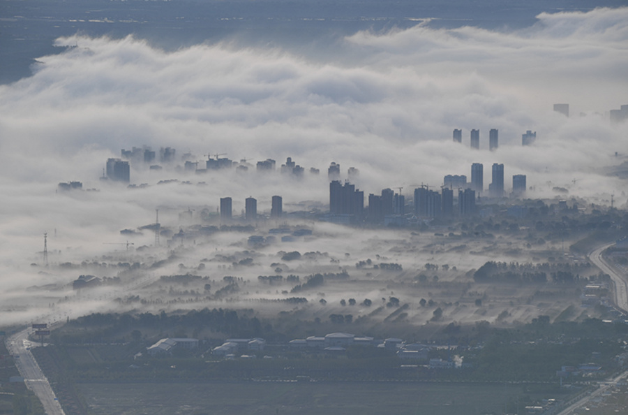 Eine spektakuläre Aussicht auf ein „Schloss in den Wolken" entstand am 8. Mai im Bezirk Kongtong in der Stadt Pingliang in der nordwestchinesischen Provinz Gansu. Nach einem Regenschauer senkte sich die Temperatur, der Himmel klarte auf, und Wasserdampf bildete sich in geringer Höhe, sodass diese traumhafte Landschaft entstand.