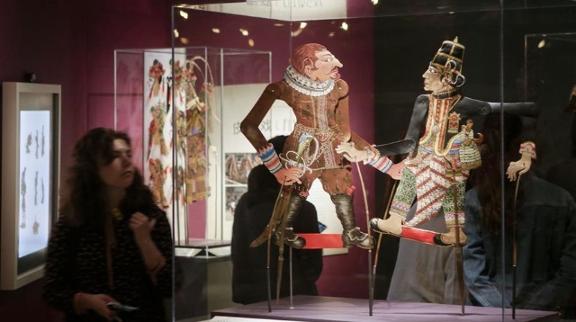 Schattenfiguren aus Indonesien werden auf der Ausstellung "Shadows, Strings and Other Things" im Museum of Anthropology (MOA) im kanadischen Vancouver ausgestellt (Foto vom 16. Mai 2019). Die Ausstellung "Shadows, Strings and Other Things" zeigt mehr als 250 handgefertigte Figuren aus der MOA-Sammlung und Neuerwerbungen aus China, Brasilien, Italien, Großbritannien und Frankreich, die erstmals der Öffentlichkeit präsentiert wurden.