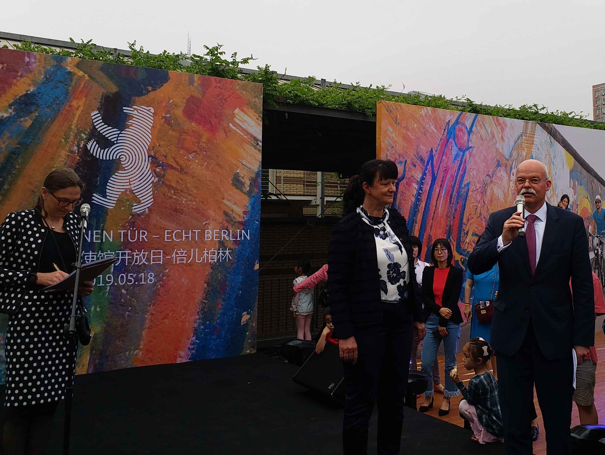 BotschafterClemens von Goetze(rechts) führte in die Feier ein. Das Jahr 2019 war gut gewählt, denn in diesem Jahr feiert die Hauptstadt Deutschlands gleich vier Jubiläen: 100 Jahre Frauenwahlrecht, 70 Jahre Grundgesetz, 30 Jahre Mauerfall und die Städtepartnerschaft zwischen Berlin und Beijing jährt sich zum 25. Mal.