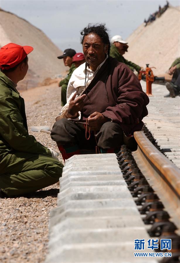 Am 20. Juni 2004 unterhält sich ein Tibeter, der zum ersten Mal eine Eisenbahn sah, mit den Arbeitern