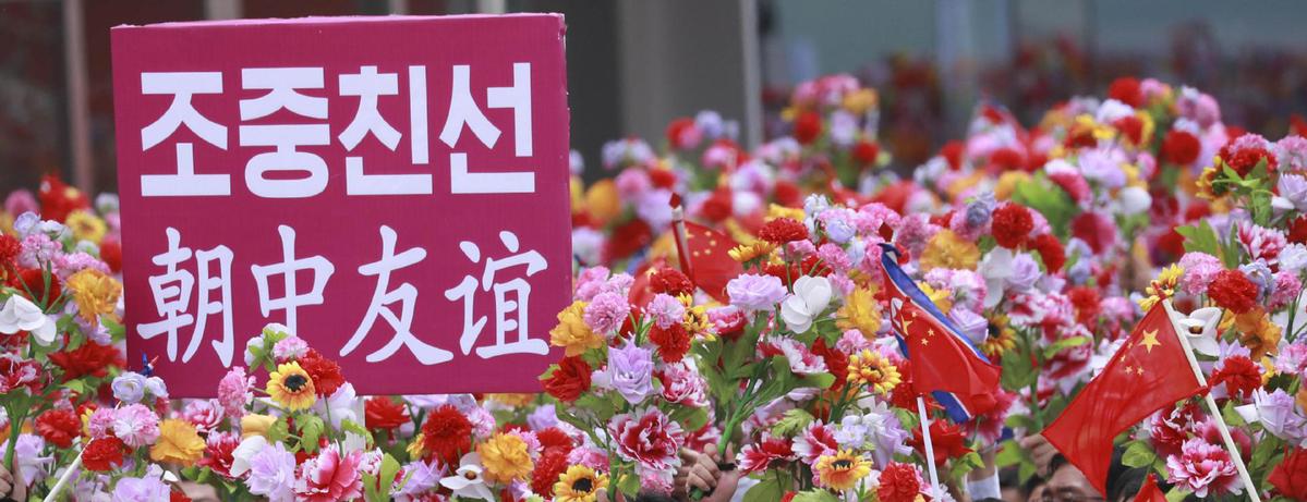 Chinas Staatspräsident Xi Jinping wird auf dem Platz vor dem Kumsusan-Palast der Sonne in Pjöngjang herzlich willkommen geheißen. Ein Schild mit der Aufschrift „Nordkoreanisch-Chinesische Freundschaft“ in einem Blumenmeer.