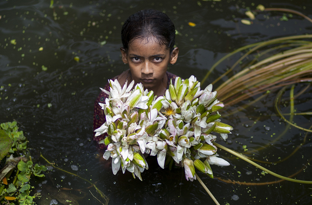 Bauern pflücken Seerosen in Bangladesch. Die Seerose ist die Nationalblume des Landes.