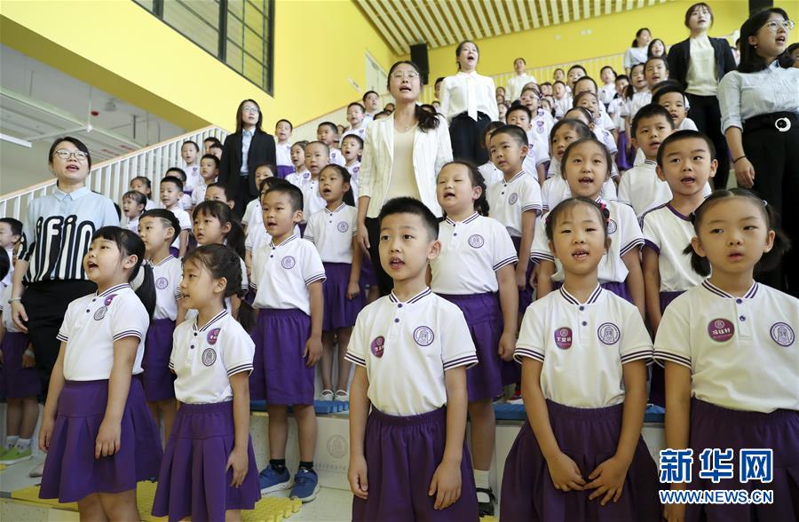 In der neu gegründeten Guanghua-Grundschule singen die 152 Schulanfänger und ihre Lehrer die Nationalhymne.