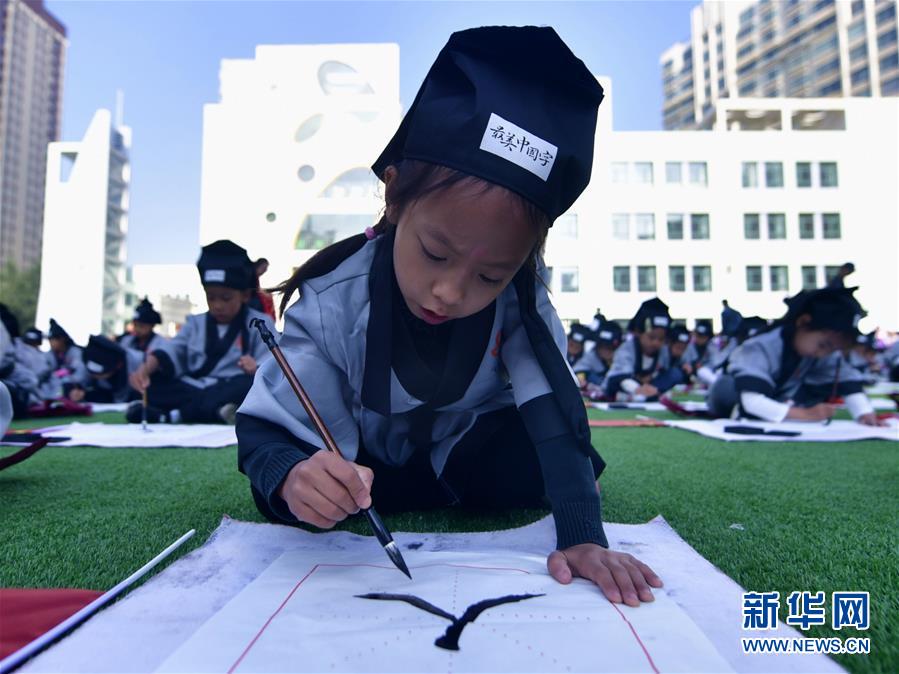 Am 1. September schreiben die Schulanfänger aus der Wenhui-Grundschule in der nordwestchinesischen Stadt Xining mit Schreibpinseln das chinesische Schriftzeichen „Mensch“(Ren).