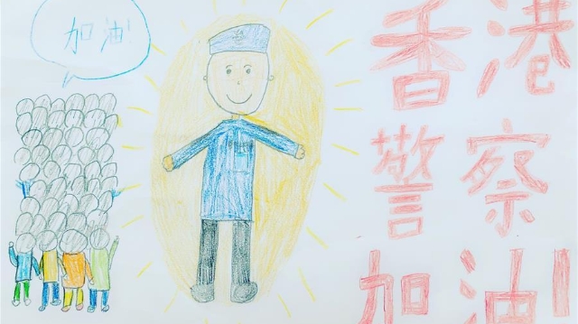 Haozai, ein in Hongkong lebender fünfjähriger Junge, hat ein Bild der Hongkonger Polizei gemalt. Einschließlich Haozai haben insgesamt 120 Kinder solche Bilder gemalt. Die Bilder zeigen die Stärke und den Mut der Polizisten, die Hongkong aktuell gegen die Gewalt verteidigen. In letzter Zeit wurden diese Bilder gesammelt und Bildbände daraus gemacht. Die Mütter der Kinder haben die Bildbände an die Hongkonger Polizeidienststellen geschickt. Bis Montag ist der erste Schub der Bildbände an die Polizei geschickt worden.