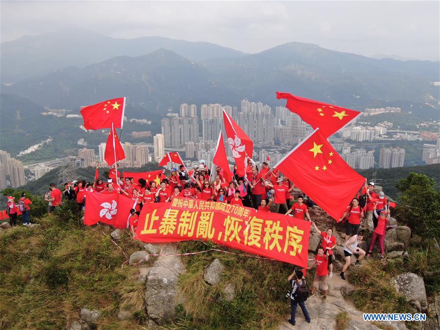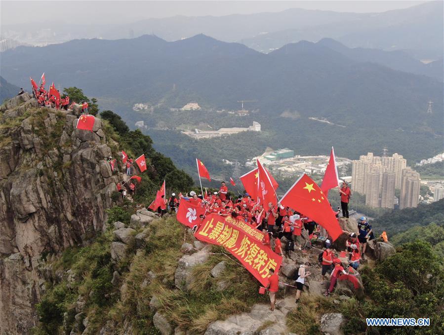 Einwohner schwenken am 14. September 2019 Chinas Nationalflagge und die Flagge der Sonderverwaltungszone Hongkong auf dem Gipfel des Lion Rock in Hongkong. Über 100 Einwohner Hongkongs schwenkten am Samstag die Flaggen und hielten Transparente in der Hand, wie zum Beispiel: „Wir feiern hier den 70. Jahrestag der Gründung der Volksrepublik China“ und „Gewalt stoppen, Chaos beenden und Ordnung wiederherstellen". (Xinhua / Lui Siu Wai)