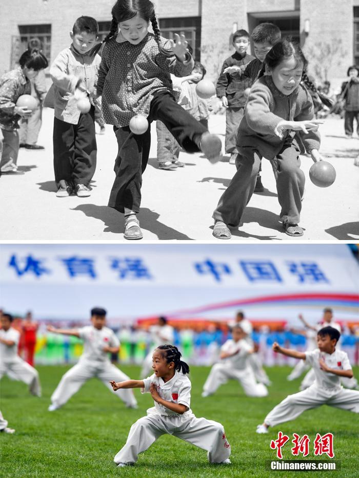 Oben: Im Jahr 1963 spielten Kinder draußen in einem Kindergarten in Beijing mit einem Ball. Foto von Zhong Xin