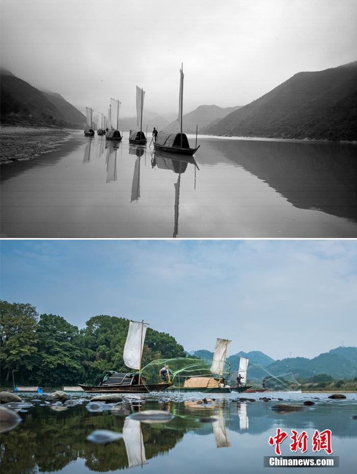 Oben: Die Segel spiegelten sich im Oujiang-Fluss der Provinz Zhejiang im Jahr 1960 wider. Foto von Shen Ming/ CNS