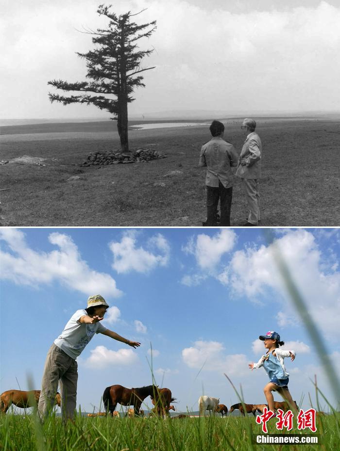 Unten: Im Jahr 2016 spielte ein Kind mit seiner Großmutter auf demselben Gebiet. Innerhalb eines halben Jahrhunderts ist aus Saihanba ein nationaler Waldpark mit der weltweit größten Plantage geworden. Er bedeckt eine Fläche von 75.000 Hektar. Foto von Yang Kejia/CNS