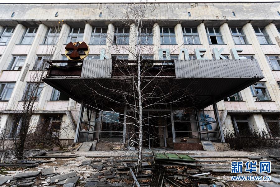 Ein Baum steht vor dem Eingang eines Gebäudes in der Stadt Pripyat in der Nähe des Kernkraftwerks Tschernobyl im Norden der Ukraine. (12. November 2019)