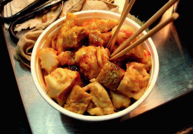 Innereien vom Rind sind ein häufiges Essen an Straßenständen in Macao. Die Innereien werden normalerweise mehrere Stunden in einem Curry-Fond geschmort und manchmal mit scharfer Soße serviert. Es lohnt sich, zu kosten, solange einen der Gedanke an das Essen von Innereien nicht stört.