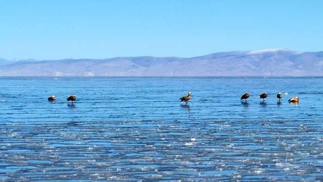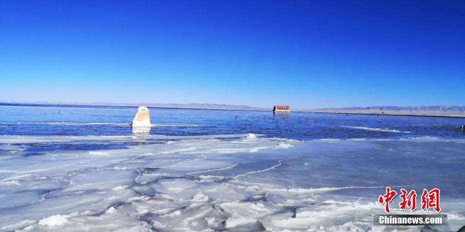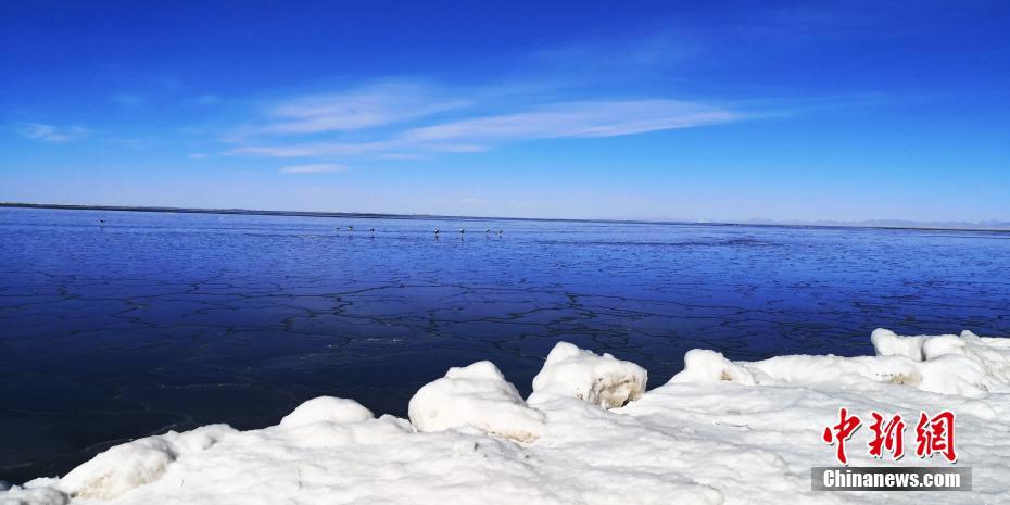 Der Qinghai-See, der in der gleichnamigen Provinz in Westchina liegt, ist der größte Salzsee Chinas. Inzwischen ist der See teilweise eingefroren und taut normalerweise erst bis Mitte April wieder völlig auf. Mit dem blauen Himmel und den Schneebergen im Hintergrund sorgte der See auf dem Qinghai-Tibet-Plateau nun für eine wunderbare Szenerie. Das Foto zeigt einige auf der zugefrorenen Seefläche weilende Vögel. (Zhao Haimei/ Chinanews)