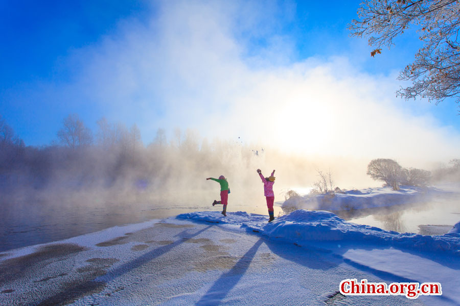 Touristen im Dorf Beiji bei dem Spiel „Wasser in Eis sprühen." [Archivefoto/Xinhua] Das Dorf Beiji ist Chinas nördlichster Punkt. Es liegt in der Stadt Mohe in der Provinz Heilongjiang im Nordosten Chinas.