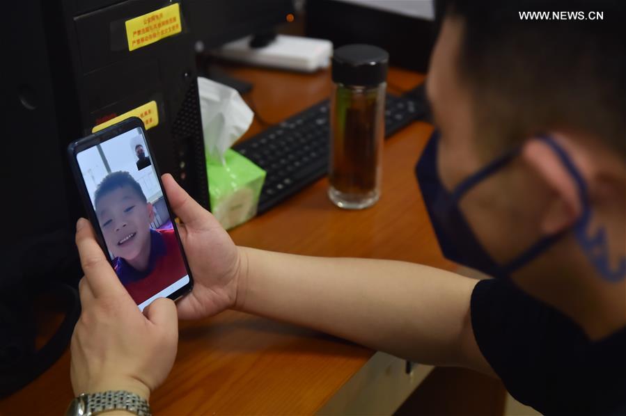 Während der Mittagspause führt Wu ein Video-Gespräch mit seinem Sohn.