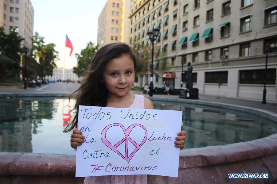 Danna Suarez, ein 5-jähriges Mädchen, zeigt ihre Zeichnung als Aufmunterung für China im Kampf gegen das neuartige Coronavirus in Santiago in Chile [Foto vom 10. Februar 2020, Xinhua]