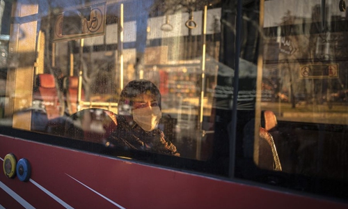 Eine Frau mit einer Gesichtsmaske in einem Bus während des Ausbruchs der Infektionen mit dem neuartigen Coronavirus in Teheran, Iran, 2. März 2020 (Foto: Ahmad Halabisaz/Xinhua)