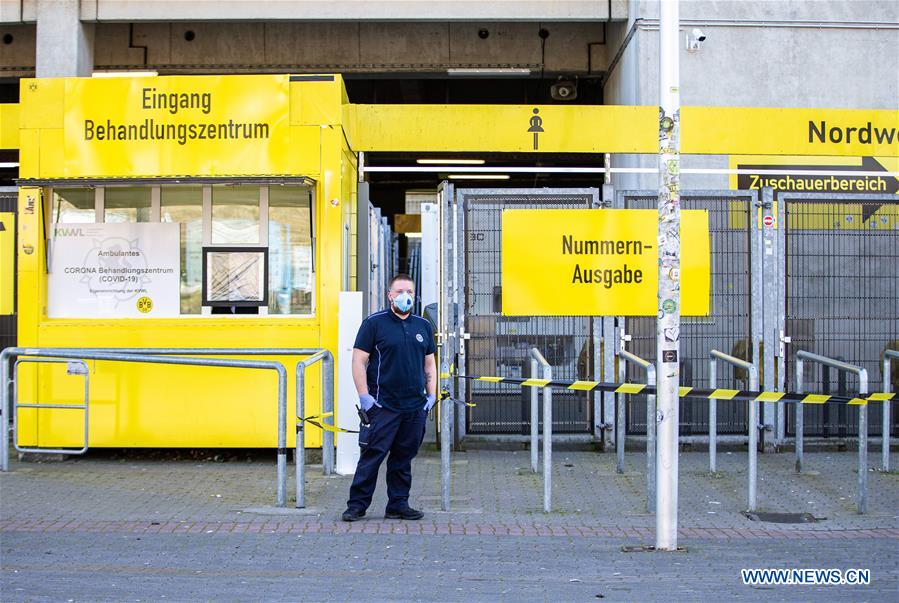 Ein Sicherheitsbeamter mit Schutzmaske bewacht das COVID-19-Testzentrum am 4. April 2020 im Stadion von Borussia Dortmund in Dortmund.