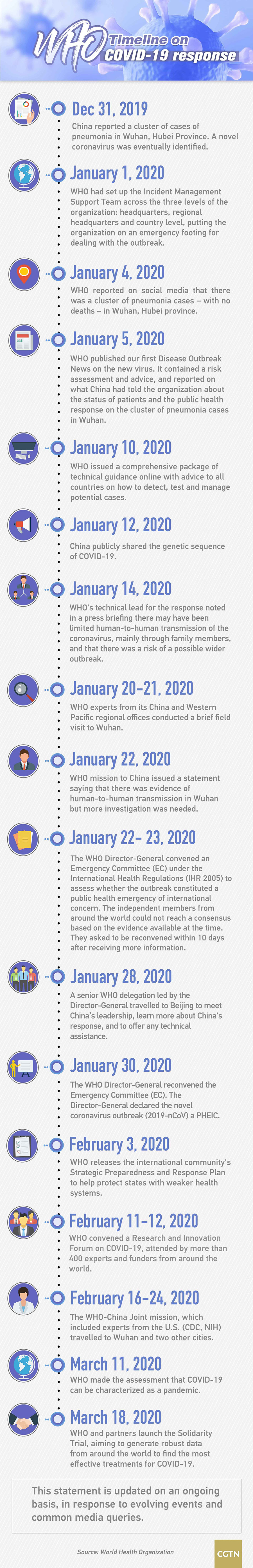 Die Weltgesundheitsorganisation veröffentlichte am 8. April einen Zeitstrahl ihres Kampfes gegen COVID-19, nachdem der US-Präsident Donald Trump die Organisation beschuldigt hatte, zu spät vor dem neuartigen Coronavirus gewarnt zu haben.