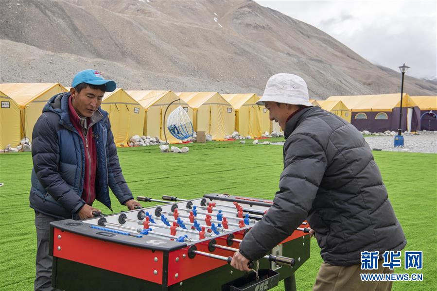 Bergsteiger spielen im Everest-Basislager Tischtennis (Foto vom 1. Mai).
