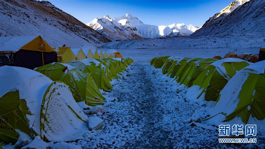 Das Basislager des Mount Everest befindet sich in einer langen, schmalen Senke auf einer Höhe von 5200 Metern am Fuße des Mount Everest. Hier hat sich das Team für die Höhenvermessung des Everest vor einem Monat „niedergelassen".