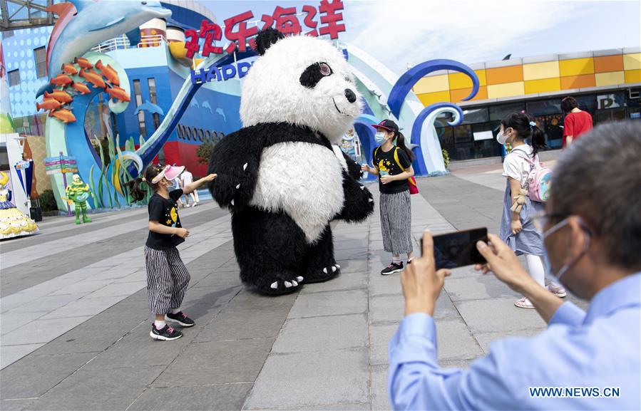 Touristen sind im Happy Valley Wuhan von einem Mitarbeiter im Panda-Kostüm begeistert.