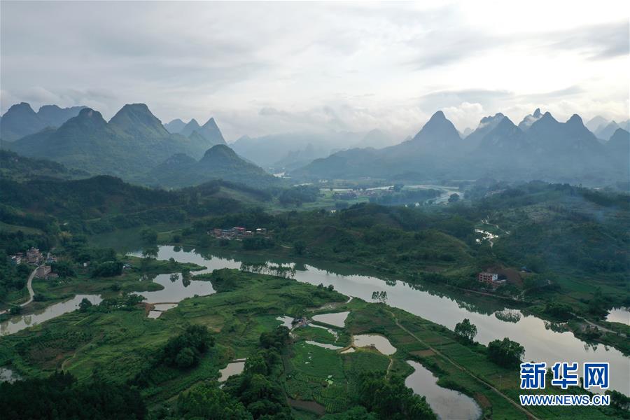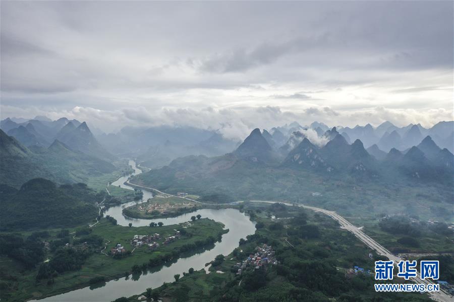 Das Luftbild vom 21. Mai 2020 zeigt eine Ansicht des Autonomen Kreises Huanjiang der Maonan.